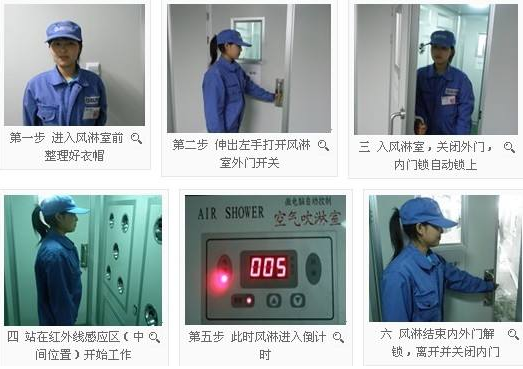 打開外門----內門上電鎖------進入風淋室-------關上外門(語音提示站在感應區(qū)內)內外門自鎖------ 紅外感應吹淋開始(語音提示吹淋過程)---------吹淋完畢(語音提示)-----進入潔凈室(內門自動解鎖)。
